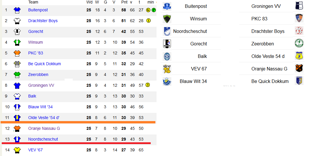 VEV'67 leek dood en begraven maar won zijn laatste twee wedstrijden, Oranje Nassau had als doelstelling een plekje bij de eerste 4 maar kan bij verlies rechtstreeks degraderen. Zijn ook compleet uit vorm. In de laatste 6 wedstrijden kwamen ze vijf wedstrijden niet tot scoren, de enige dat dat wel lukte gaven ze een 0-2 voorsprong weg in Dokkum tegen Be Quick. E?n zege in de laatste 10 wedstrijden, 6 nederlagen.